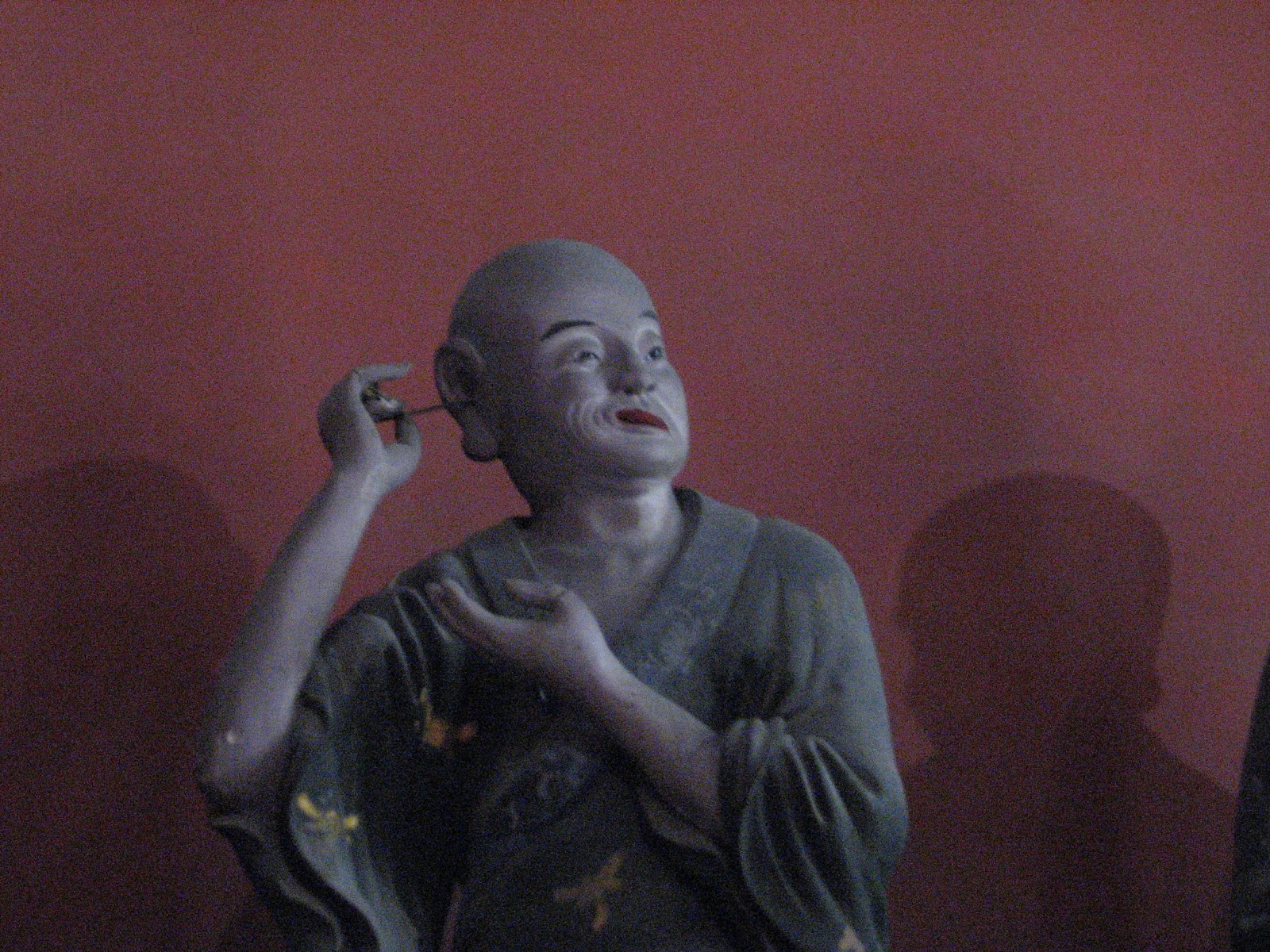 Inside the temple, around the outer walls, were about 100 different statues of who knows who. I found this guy who had eyebrows as long as the man I saw on the street in Chengdu. Next to him, the guy looks bored and sleepy. Then there's the one who's cleaning out his ear? Not sure I understand Chinese religious art.