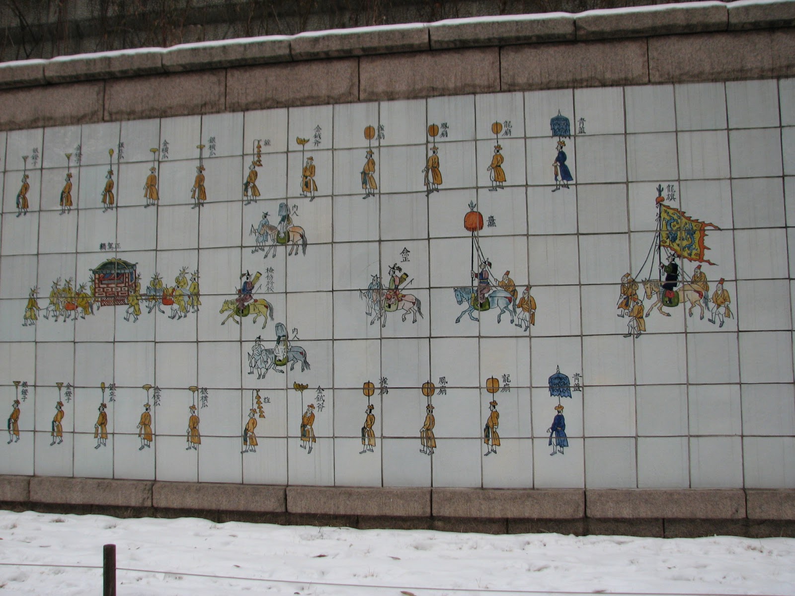 There was one section of the wall that had a huge tile replica of a famous painting depicting one of the Kings making a parade to the grave of his father. They even had speakers in the rocks that played Korean instruments (pipes) and horses hooves so you were really part of the scene! It was really fun.